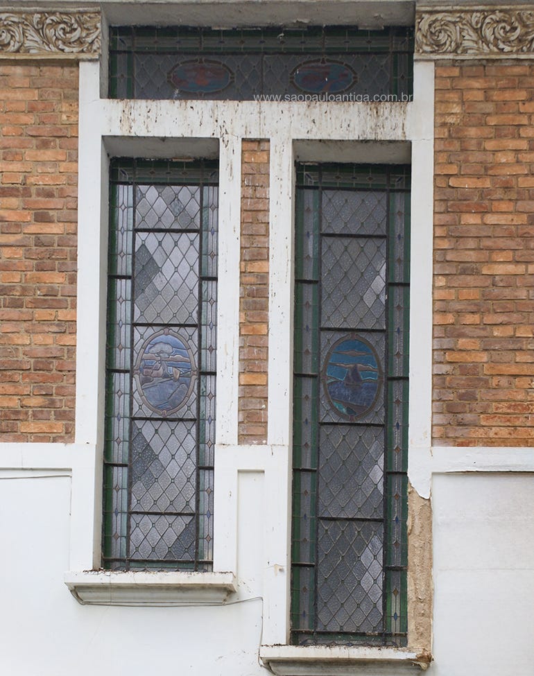 Acima, vitrais da casa mencionados no trecho citado no podcast: