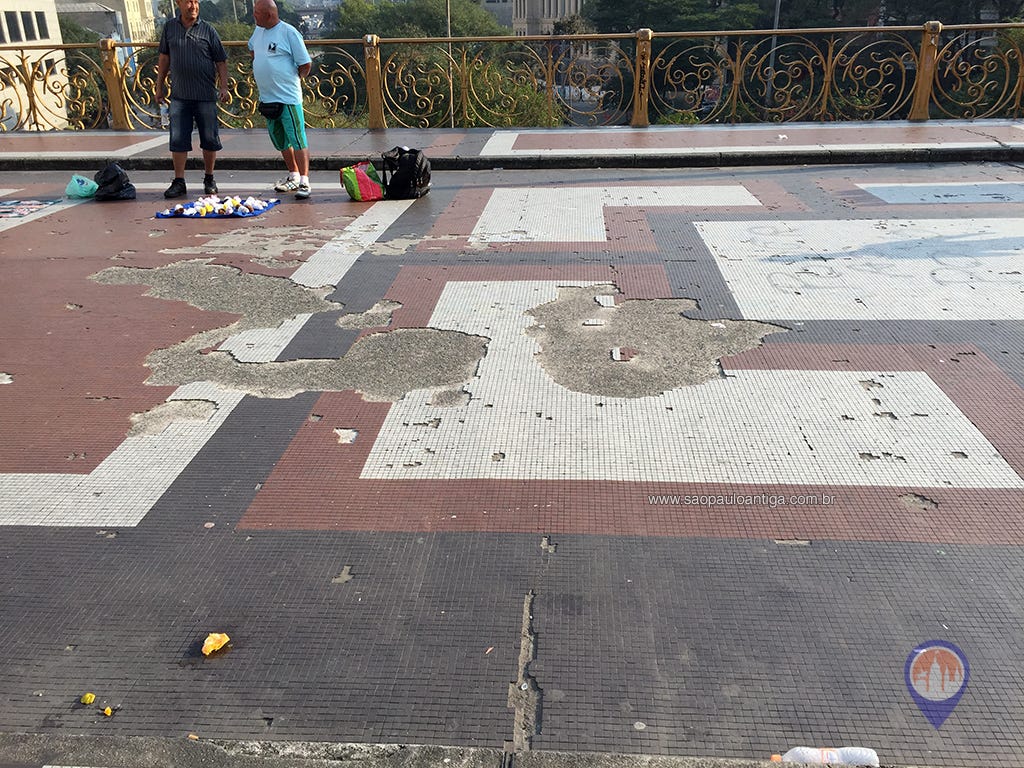 Mas não é um mistério que a obra foi muito mal executada, apresentando diversos defeitos em menos de um mês de concluída. Poucos dias depois da obra pronta fui procurado por seguidores do São Paulo Antiga que caminham pelo viaduto Santa Ifigênia com a denúncia que as pastilhas novas estão se soltando facilmente, apresentando já buracos no mosaico. Estive no local e pude constatar que estão tão mal colocadas e quase sem rejunte que estão se soltando se empurradas com os dedos. Agora imagine com pessoas caminhando e viaturas e skatistas passando por lá?