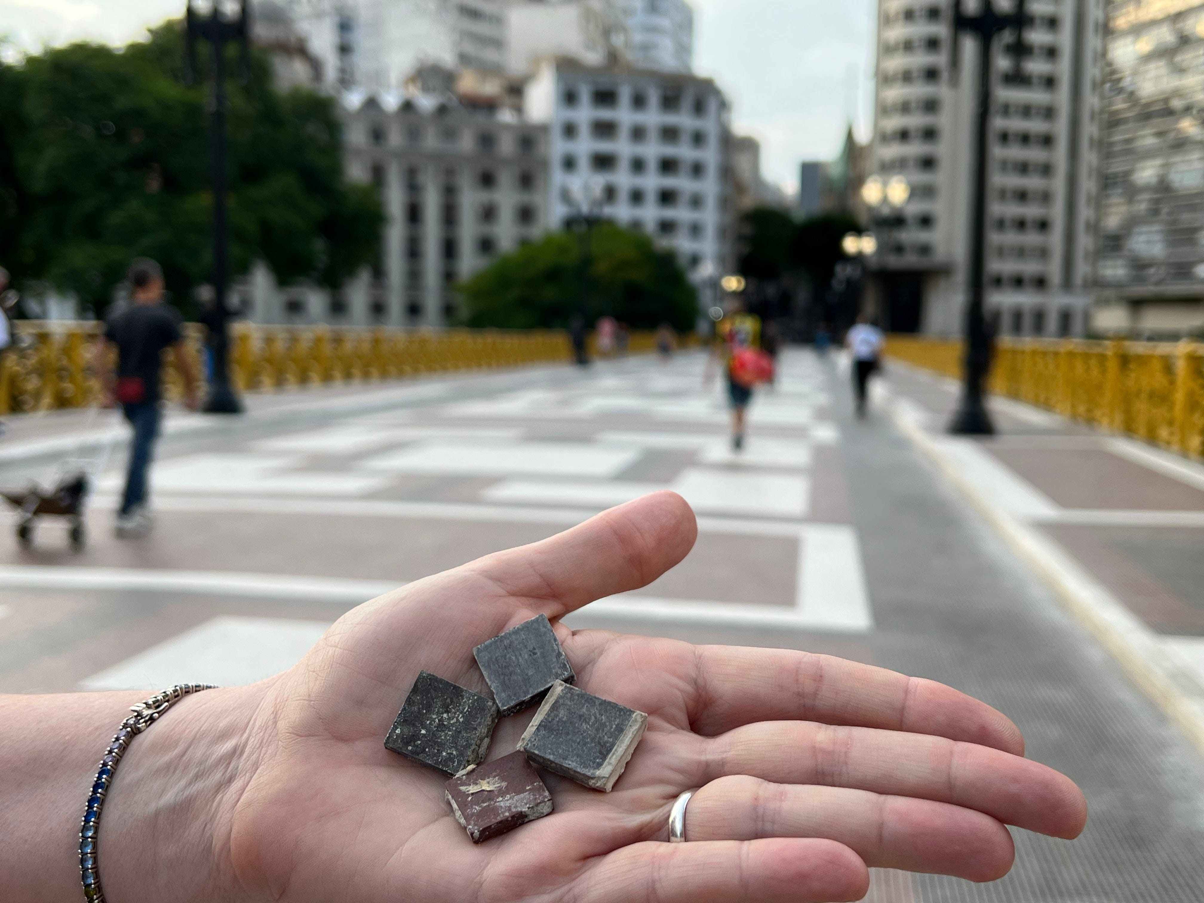As pastilhas, aliás, era o grande problema que motivou a reforma. Afinal com mais de quatro décadas de pessoas caminhando sobre elas e apenas reformas pontuais, com reposição de peças soltas era natural que precisaria de uma grande reforma, que incluiria também a escadaria do xixi (que liga o viaduto a praça Pedro Lessa), a pintura de toda a estrutura e a recuperação de ralos e tubulações de escoamento de água.